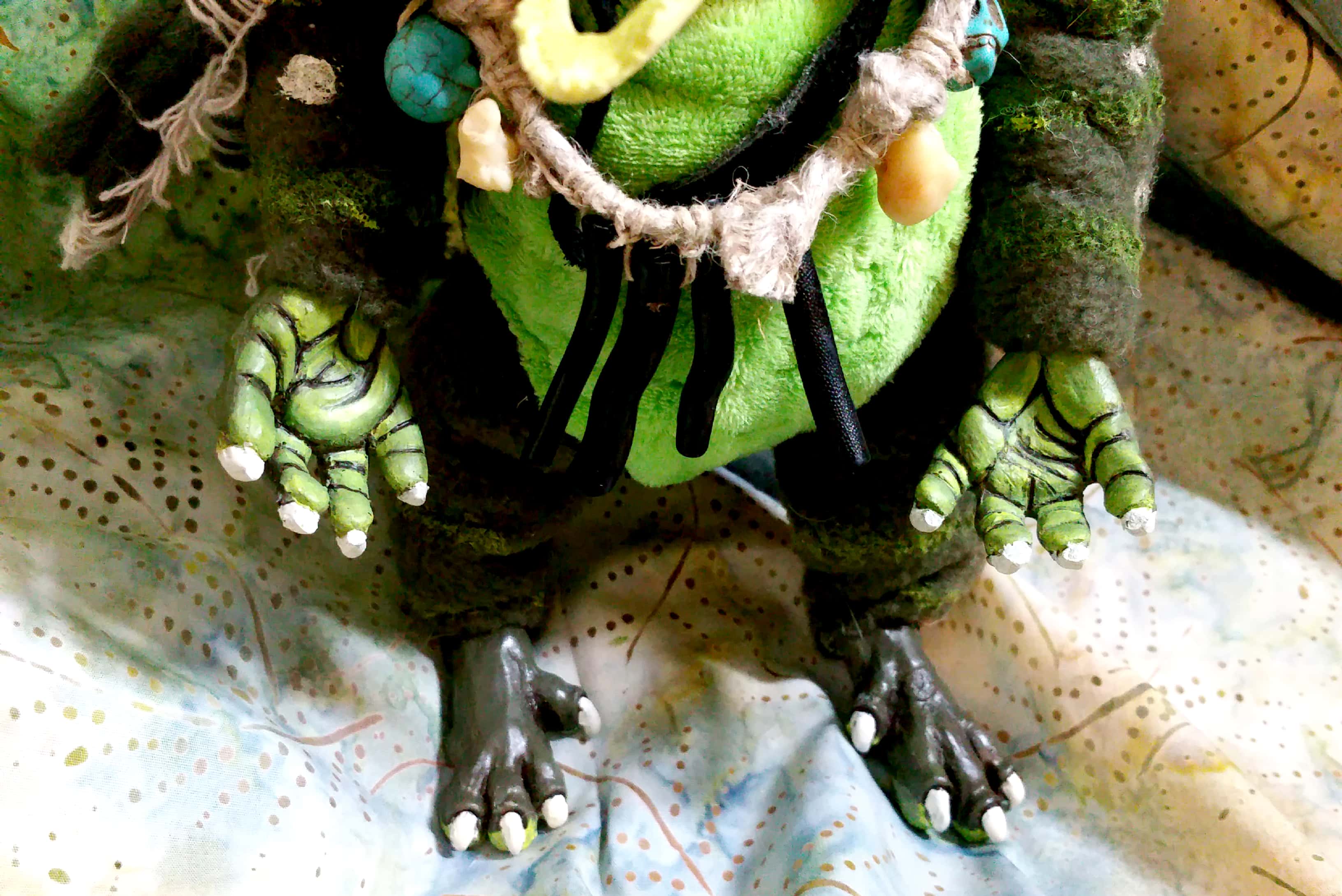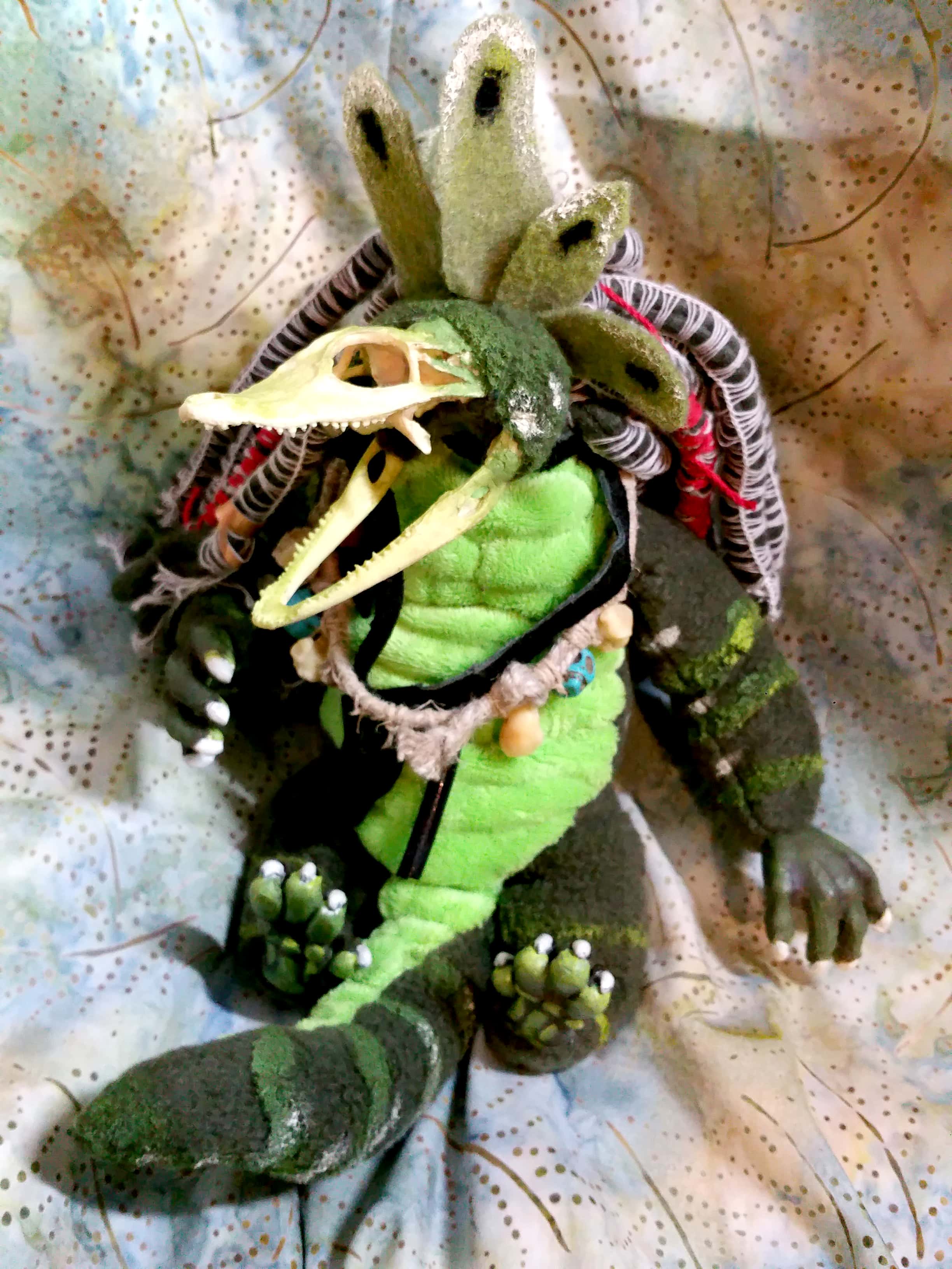The skull of this is a resin replica of a dwarf caiman, created by arctic phoenix studios. The jaw has been cut off and articulated. The hands are also cast in resin, from and original sculpt, and the feet are polymer clay.